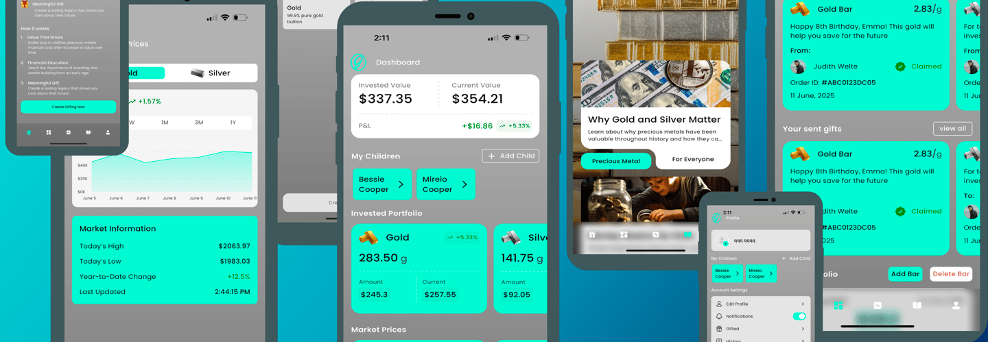 Parents and children use connected versions of the app to view their gifts, track real-time metal values, and explore simple lessons about saving, value, and financial literacy — turning each gift into a shared learning experience with value.